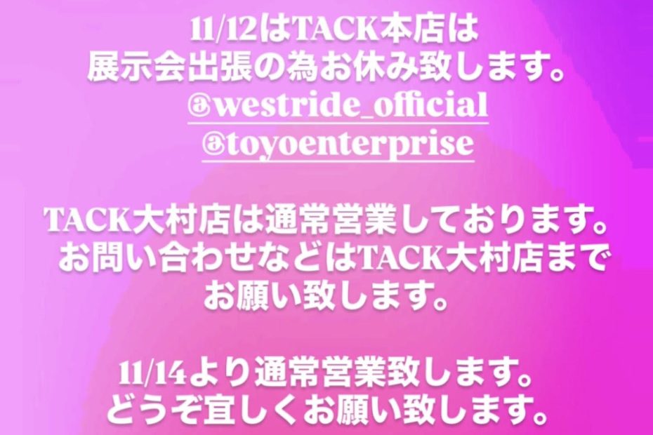 📢営業速報📢 11/12はTACK本店は展示会出張の為お休み致します。 @westride_official @toyoenterprise TACK大村店は通常営業しております。 お問い合わせなどはTACK大村店までお… 続きを読む »営業速報!!