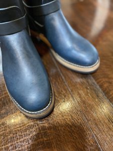 伊マリアム社製のフルベジタブルタンニング・ホースバットをインディゴ染めしたスペシャルレザーを採用した一足です。