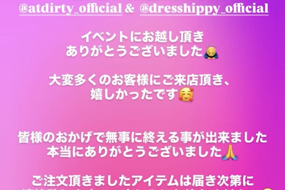 こんばんは! 3日に亘って開催致しました@atdirty_official & @dresshippy_official イベントにお越し頂きありがとうございました🙇 大変多くのお客様にご来店頂き、嬉しかったです… 続きを読む »イベント最終日までありがとうございました!!