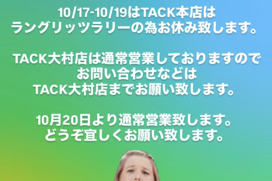 営業速報です📢 10/17-10/19はTACK本店はラングリッツラリーの為お休み致します。 TACK大村店は通常営業しておりますのでお問い合わせなどはTACK大村店までお願い致します。 10月20日より通常営業致します… 続きを読む »営業速報!!