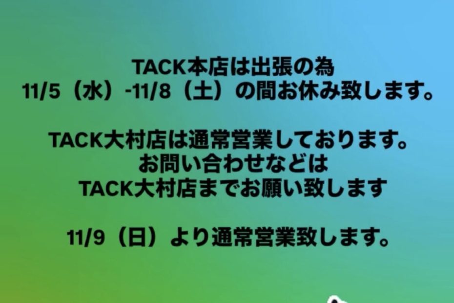 こんにちは! 営業速報です📢 TACK本店は出張の為11/5(水)-11/8(土)の間お休み致します。 TACK大村店は通常営業しております。 お問い合わせなどはTACK大村店までお願い致します 11/9(日)より通常営… 続きを読む »営業速報📢